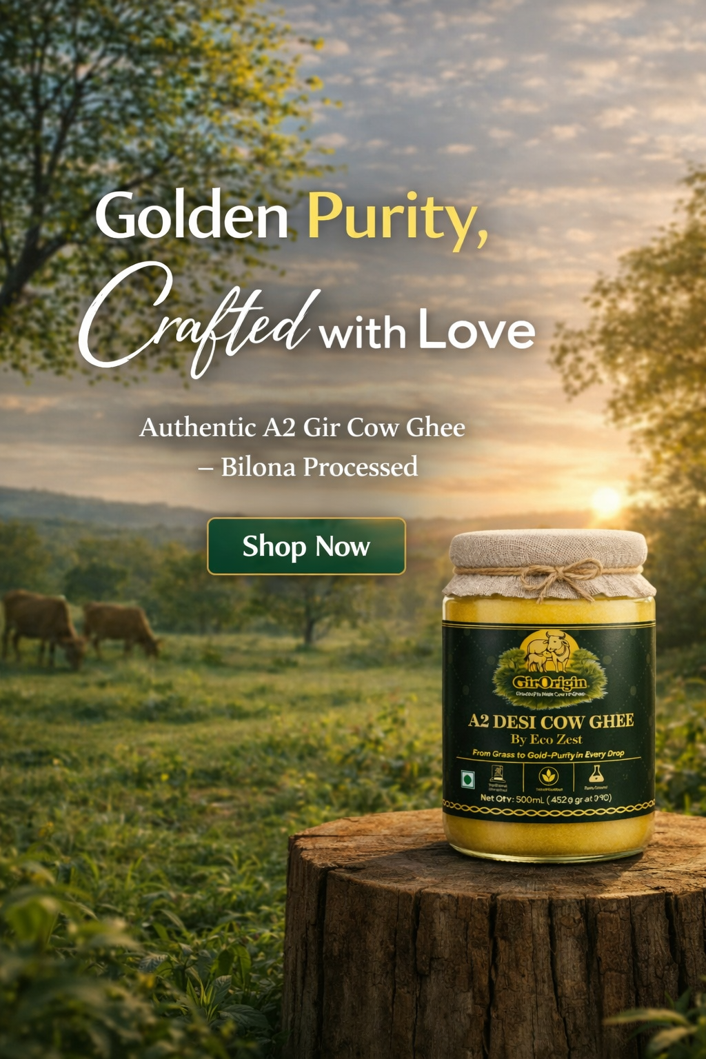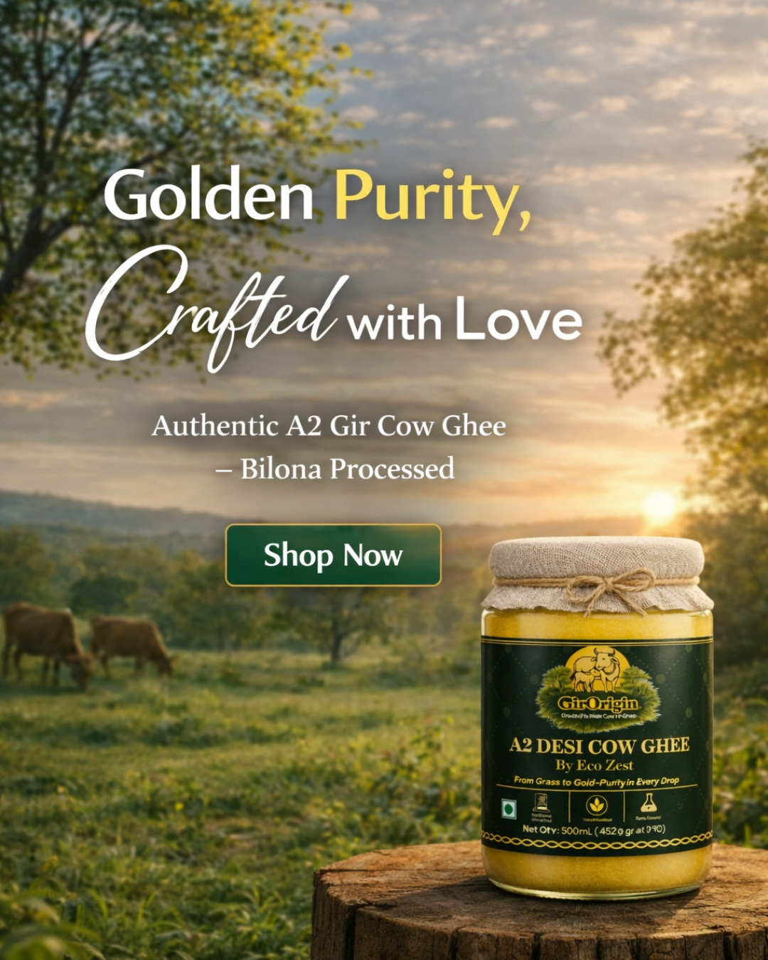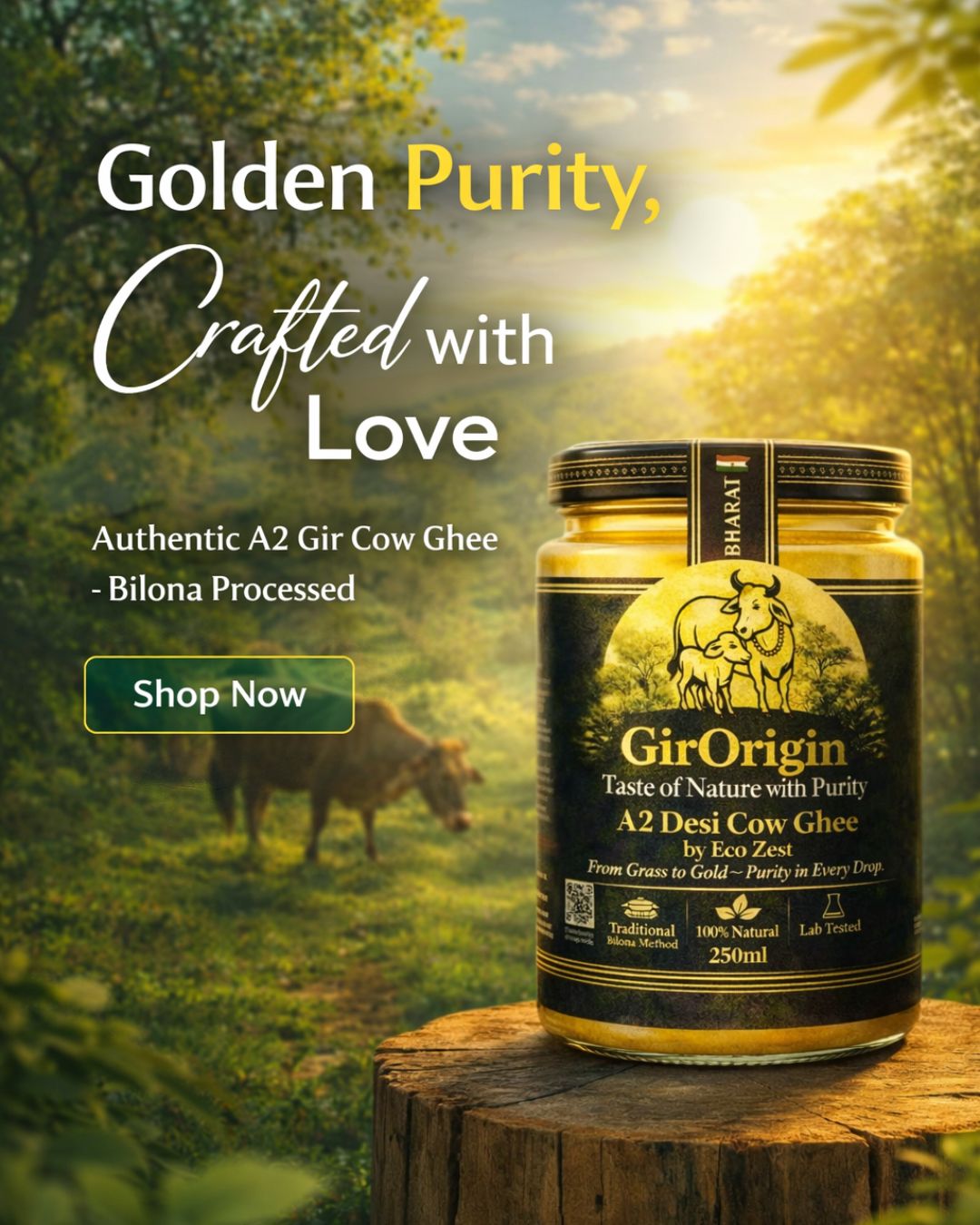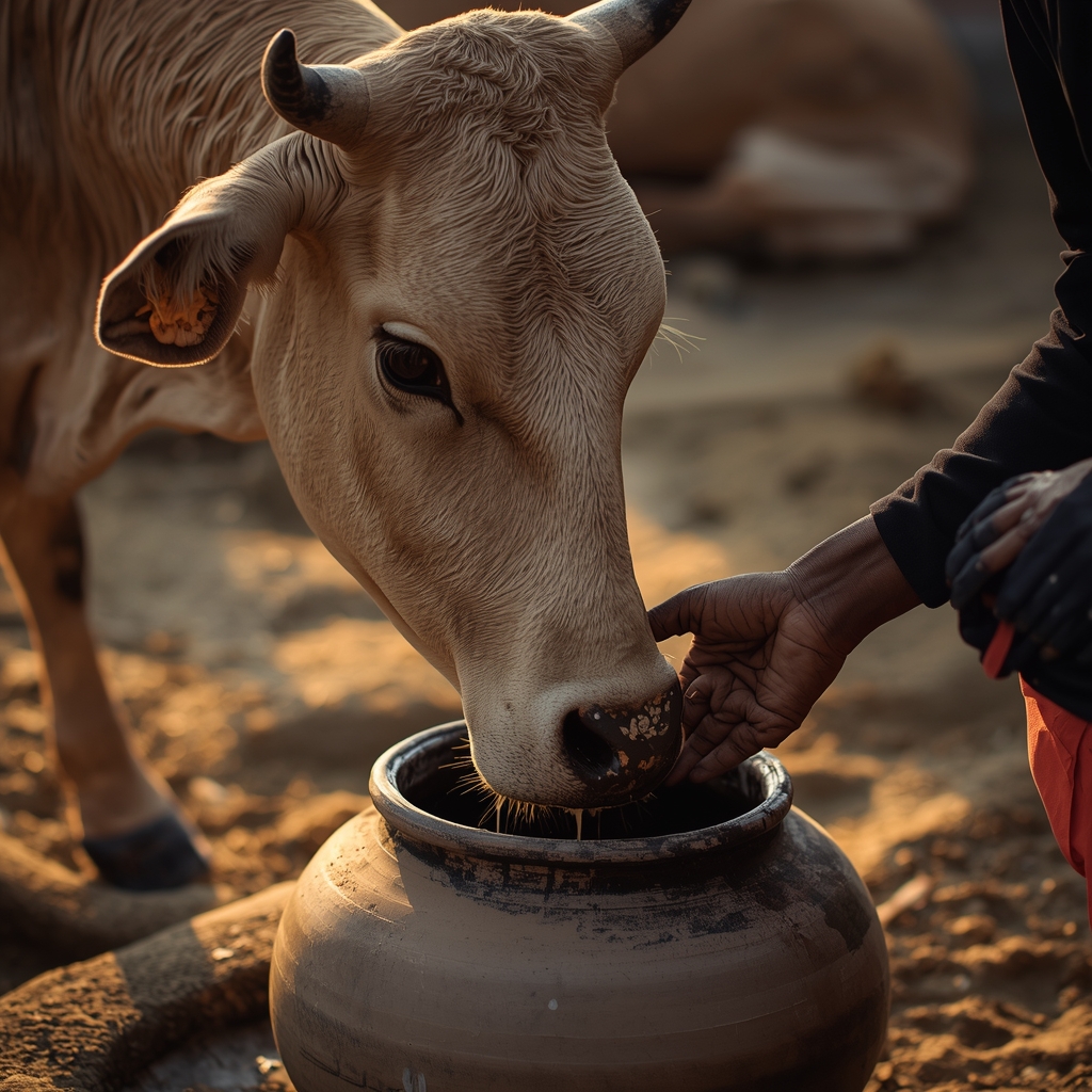 A2 Desi cows are milked by hand, honoring ancient Ayurvedic traditions for purity and authenticity.