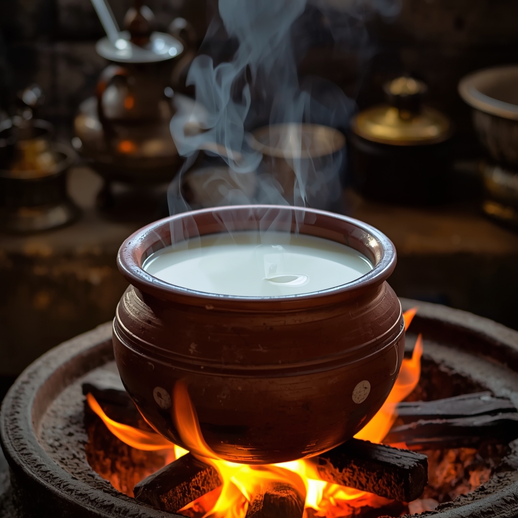 Heat A2 milk in a clay pot, add curd culture, and let it ferment into rich curd.