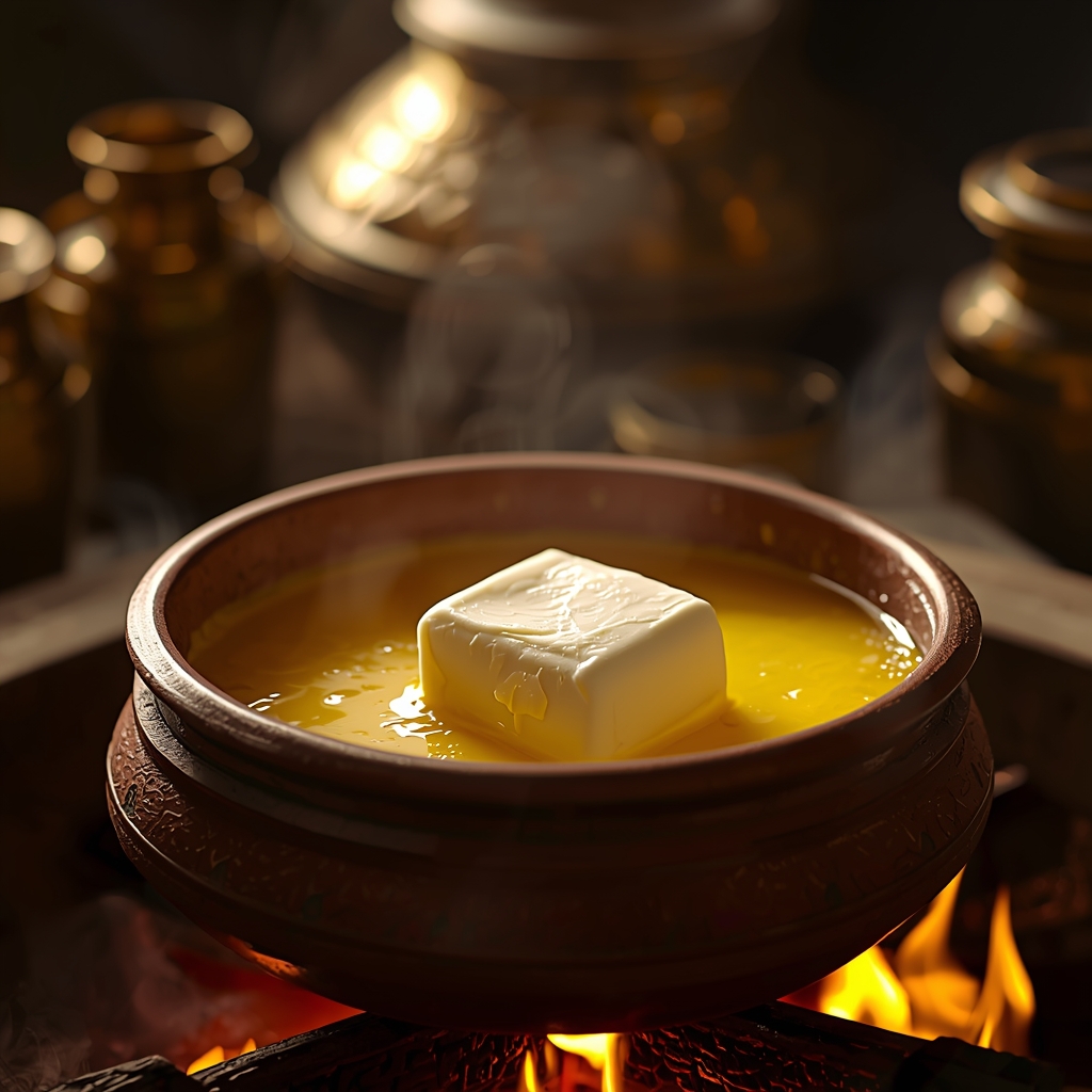 This process evaporates water content and converts the butter into golden aromatic ghee, retaining all its nutritional properties.