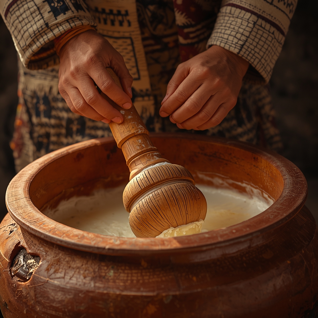 The curd is churned using a wooden bilona, extracting rich and wholesome butter.